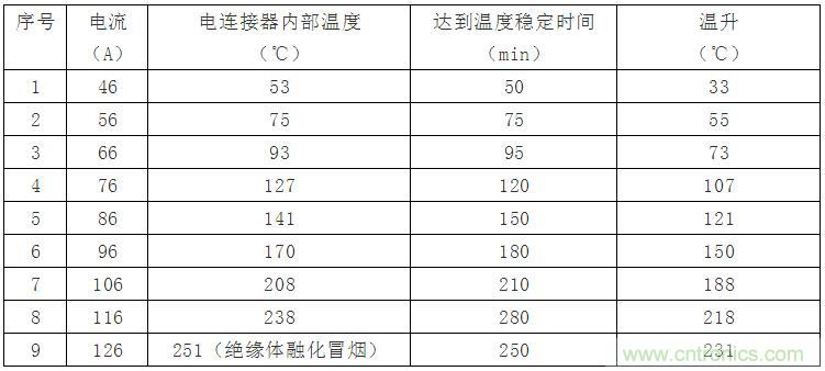 取8芯電連接器1套,接觸體壓接16mm2導(dǎo)線,送入后將所有孔位串聯(lián),通以額定電流,當(dāng)電連接器內(nèi)部溫度穩(wěn)定后,逐步增加電流值,直至溫度超過(guò)電連接器承受能力。試驗(yàn)結(jié)果見表2: