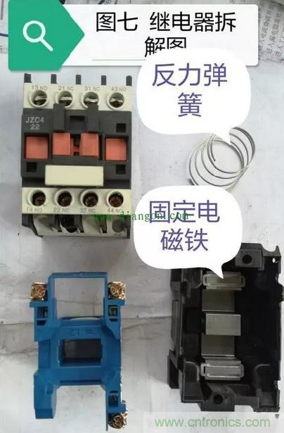 接下來(lái)我們?cè)賮?lái)看一下繼電器內(nèi)部吸合部分的構(gòu)造,在這部分當(dāng)中以固定吸合磁鐵上短路環(huán)所引發(fā)的故障最為常見,詳情請(qǐng)看圖七至圖九的展示: