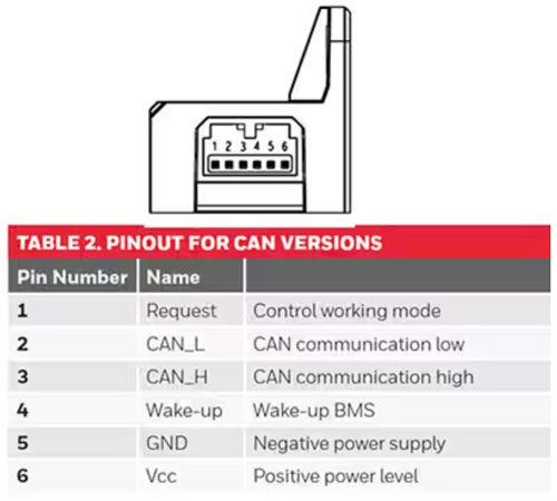圖 3:BAS 系列傳感器的引腳布局包括電源、接地、請(qǐng)求和喚醒信號(hào),以及差分 CAN 總線信號(hào)。(圖片來源:Honeywell Sensing and Productivity)