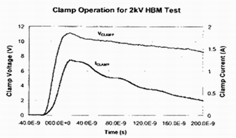大電流在ESD二極管和引線上產(chǎn)生I-R壓降,該電壓高于二極管本身的壓降。IC可靠性報(bào)告中給出了器件設(shè)計(jì)所能承受的ESD測試電壓。