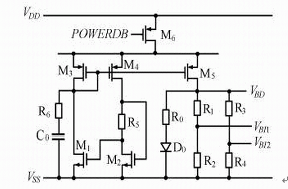 電路的工作原理為:由M1—M4和R5組成的自偏置電路產(chǎn)生具有正溫度系數(shù)的電流,它在電阻R0所產(chǎn)生的壓降和具有負(fù)溫度系數(shù)的PN 結(jié)壓降(D0上的壓降)相加,從而輸出零溫度系數(shù)的基準(zhǔn)電壓VBD;為滿足同一電路中輸出不同的基準(zhǔn)電壓源,利用電阻分壓將VBD 分成了VBI1及VBI2輸出;C0和R6組成啟動電路。