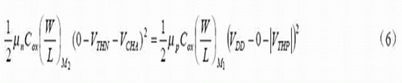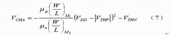 (6)式中, un和up分別為N管和P管的遷移率,VTHN和VTHP分別為N管和P管的閾值電壓,COX為氧化層電容。(6)式經(jīng)整理得: