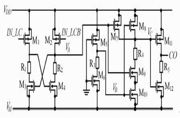 在正常的充電過程中,VM端電位小于零而接近于零,仍可近似為VSS。當(dāng)出現(xiàn)過充電或充電過流時,IN_LC=‘0’,IN_LCB=‘1’,VA為VM端電位,VB為VDD電位,VC輸出VDD電位,因此CO與VM等電位。