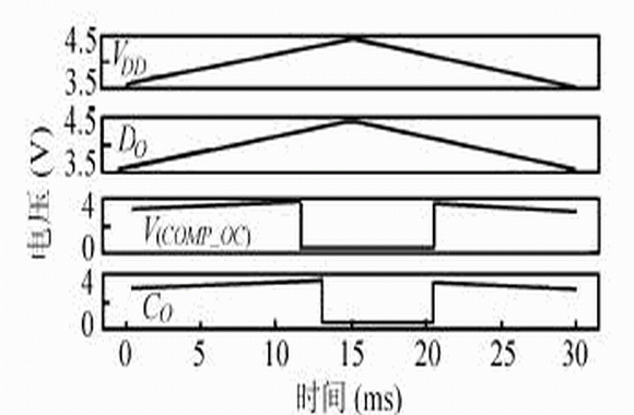 0V 電池充電抑制功能發(fā)生在充電過程中,此時,IN_LCB=‘0’,IN_LC=‘1’,VA 為高電平。當(dāng)電池電壓VDD小于或等于1V時,M5關(guān)閉,另外,較小的電池電壓使其內(nèi)阻變小,接近內(nèi)部短路。在這種情況下充電,充電電流一定很大,導(dǎo)致VM的電位下降很大,使M6 導(dǎo)通,VB由低電平轉(zhuǎn)化為高電平,CO端輸出電位接近VM電位。