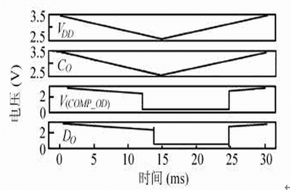 芯片的所有功能和主要參數(shù)均用HSPICE 進(jìn)行了模擬驗證。圖8 給出了過充電保護(hù)檢測和釋放波形圖,圖9 給出了過放電保護(hù)檢測和釋放波形圖,其中COMP_OC 為過充電比較器的輸出信號,COMP_OD 為過放電比較器的輸出信號;芯片的過充電和過放電檢測精度約為30mV,在正常工作時消耗的電流為3.23uA,在待機(jī)狀態(tài)時消耗的電流為0.15uA。