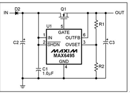 過(guò)壓保護(hù)(OVP)器件數(shù)據(jù)資料中提供的典型電路可以滿足大多數(shù)應(yīng)用的需求(圖1)。然而,有些應(yīng)用需要對(duì)基本電路進(jìn)行適當(dāng)修改。本文討論了兩種類似應(yīng)用:增大電路的最大輸入電壓,在過(guò)壓情況發(fā)生時(shí)利用輸出電容存儲(chǔ)能量。