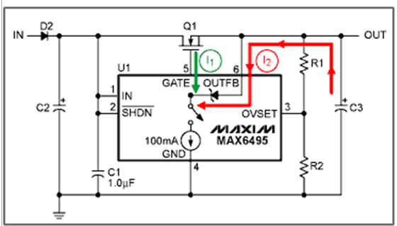 MAX6495–MAX6499/MAX6397/MAX6398通過(guò)內(nèi)部100mA的電流源(見(jiàn)圖4)連接到GATE輸出,以對(duì)柵極電容和輸出電容放電。電流源先對(duì)GATE放電(電流I1,綠色箭頭),直到GATE的電壓等于OUTFB電壓,然后斷開(kāi)FET,電流源繼續(xù)降低GATE電壓,最后,直到內(nèi)部的箝位二極管變?yōu)檎蚱茫瑢?duì)輸出電容放電(電流I2,紅色箭頭)。