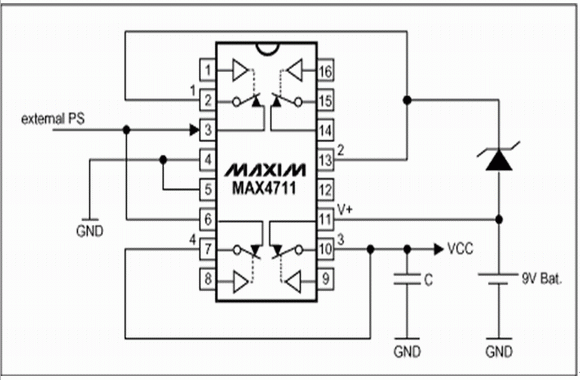 在圖8所示電路中,低電壓故障保護開關(guān)在檢測到有外部電源(如墻上適配器)接入時,會切斷內(nèi)部電源(一節(jié)9V電池或兩節(jié)串連的鋰電池)。通常情況下,開關(guān)由電池通過13引腳供電。低電壓肖特基二極管阻止非充電電池被外部電源充電。