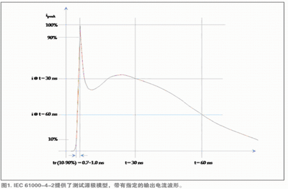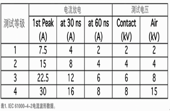 目前最常用的ESD抗擾度標準是IEC 61000-4-2標準。該系統(tǒng)級標準規(guī)定了一個源極模型,后者包含一個150pF電荷存儲器(在330 ohm源極電阻后面)和一個特定的電流放電波形(圖1和表1)。與舊標準規(guī)定的源極相比,大電荷存儲器和低源極電阻使源極模型能交付更多能量和更大電流。