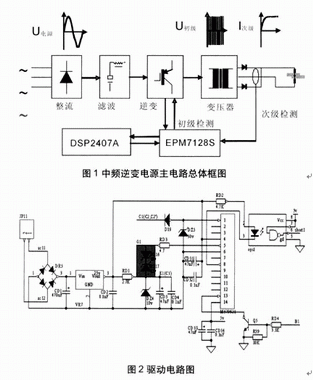 中頻逆變直流電阻焊機(jī)的供電電源是由三相工頻交流電源經(jīng)整流電路和濾波電容轉(zhuǎn)換成直流電源,再經(jīng)由功率開關(guān)器件組成的逆變電路轉(zhuǎn)換成中頻方波電源,然后輸入變壓器降壓后,經(jīng)低管壓降的大功率二極管整流成直流電源,供給焊機(jī)的電極,對(duì)工件進(jìn)行焊接(見圖1)??刂齐娐凡糠钟蒁SP和CPLD組成,DSP(TMS320LF2407A)產(chǎn)生的PWM波和檢測(cè)信號(hào)、保護(hù)信號(hào)在CPLD(EPM7128S)里現(xiàn)實(shí)邏輯運(yùn)算。