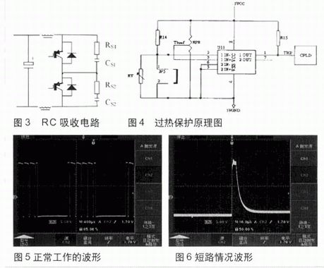 本文采用普通散熱器與強(qiáng)迫風(fēng)冷相結(jié)合的措施,并在控制電路上加過熱檢測(cè)保護(hù)電路,應(yīng)付IGBT與散熱器接觸不良或者非正常情況,在IGBT散熱片上安裝熱敏電阻,然后通過邏輯判斷電路給出信號(hào),供控制電路處理(見圖4)。