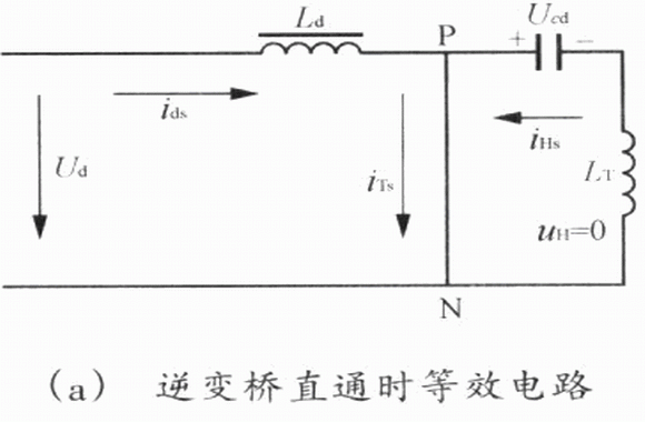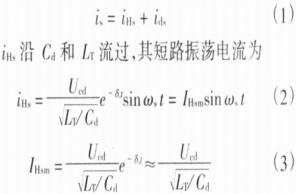 在負(fù)載短路時(shí),逆變橋囚侵入干擾信號(hào)而產(chǎn)生直通短路,逆變橋輸入電壓突降為零。這時(shí),原來(lái)儲(chǔ)藏在濾波電感Ld中的磁能和隔直電容Cd中的電能均分別以短路電流ids和iHs的形式向逆變電路釋放,等效電路圖為圖2(a)所示。橋中IGBT流過(guò)的短路電流is為