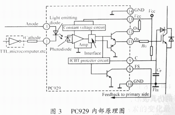 所謂降柵壓慢關(guān)斷技術(shù)指的是,當(dāng)IGBT出現(xiàn)過(guò)流時(shí),先將其柵極驅(qū)動(dòng)電壓降低,然后將其關(guān)斷,一是延長(zhǎng)了IGBT能夠承受過(guò)流的時(shí)間,二是可以降低器件受到過(guò)流沖擊的幅度。過(guò)流時(shí)器件通態(tài)壓降升高,管子瞬時(shí)熱損耗急劇增加,為防止器件熱損壞,過(guò)流時(shí)間應(yīng)足夠短,一般<10μs。SHARP公司的光耦合器PC929將這一功能和驅(qū)動(dòng)電路集成在一起,器件內(nèi)部原理圖如圖3所示。