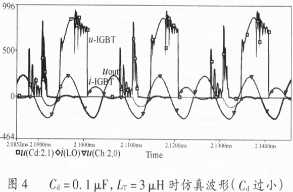 從減小短路電流的角度看,Cd要盡可能小,LT要盡可能大。但Cd過(guò)小,電路工作時(shí)存在以下缺點(diǎn):隔直效果不理想;輸出電壓正弦失真度過(guò)高,輸出電壓降低,加熱效果不理想;反并二極管重新導(dǎo)通,增加二極管的電流容量,如圖4所示。