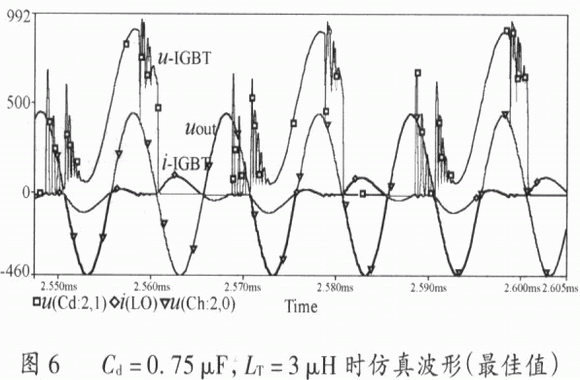 圖6是LT/Cd=4,Cd=0.75μF,LT=3μH時(shí)的仿真波形,通過(guò)與圖4和圖5的對(duì)比可以看出,此時(shí)參數(shù)選擇最為合適。