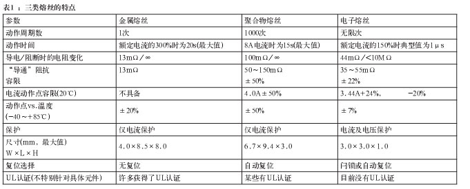 聚合物器件以導(dǎo)電型塑料制成,這些器件在電流(內(nèi)部熱量)達(dá)到預(yù)設(shè)定的電平時會改變它們的阻抗。這些器件也經(jīng)常與TVS器件一起使用,就像金屬熔絲那樣。電子熔絲是半導(dǎo)體電路,控制功率開關(guān)(通常是功率MOSFET),并按照預(yù)設(shè)的參數(shù)改變其阻抗。表1簡單比較了這三類熔絲。