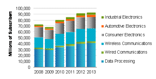 據(jù)iSuppli 公司研究,2009 年中國(guó)半導(dǎo)體市場(chǎng)為682億美元,較去年下滑6.8%。相對(duì)于全球半導(dǎo)體市場(chǎng)的萎縮,中國(guó)市場(chǎng)的下滑要小的多。受經(jīng)濟(jì)危機(jī)影響,全球電子產(chǎn)品的產(chǎn)值為1.4萬億美元較2008年下降了9%。與此同時(shí),全球半導(dǎo)體市場(chǎng)2009年將下降16.2%到2295億美元。但是在出口增長(zhǎng)和內(nèi)需拉到的雙重作用下,中國(guó)半導(dǎo)體市場(chǎng)在2010年成長(zhǎng)17.8%。 全球半導(dǎo)體市場(chǎng)2010年也將增長(zhǎng)13.7% 到2610億美元。