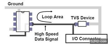幅射噪音與受射頻信號影響的問題可以透過盡可能縮減由高速資料與接地線所形成的迴路區(qū)大小來降低,一個解決迴路區(qū)最小化問題的有效方法是在印刷電路板設計上加入接地面,特別是在走線長度相對較長時,雖然將TVS元件與晶片間的距離盡量加大可以提供隔離,但卻可能增加回路區(qū)的面積大小,請參考(圖三)。