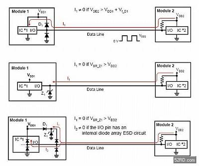 突崩式TVS二極管雖然擁有高突波規(guī)格,但相對較大的電容值使得這類元件成為負載切換開關與直流電源匯流排保護應用的較佳選擇,相反地,二極管陣列適當?shù)耐徊ㄒ?guī)格與較小的電容值則較適用于高速資料連接線的保護,突崩式TVS與二極管陣列通??梢越换ナ褂茫糠蓦娐吩谶x擇適合採用的元件時則需要經過仔細的分析。(圖四)描述了當存在一個電流可以透過資料線流經二極管陣列路徑時所發(fā)生的向后驅動問題,如果VDD2大于VDD1,那么資料連接線有可能意外地提供電源給模組1,這個情況可能會造成邏輯晶片的電源啟動問題,或是在斷電后模組1上指示燈被點亮的異常狀況。