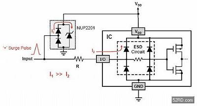 理想的外加TVS元件應該能夠吸收所有突波脈沖的能量,但是在實際上則不然,部分的突波電流能量可能會通過晶片內部的保護電路,一個限制電流流入內部保護電路的方法是使用一顆串接電阻,如(圖六)。雖然內部保護電路在避免組裝時發(fā)生ESD失效的表現(xiàn)上相當良好,但保護元件相對較小的尺寸則限制了它們承受正常產品使用情狀下所發(fā)生突波信號的能力,另一方面,雖然二極管的突波處理能力與體積成正比,但通常在晶片中整合較大型的保護元件并不實際。