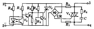 過零觸發(fā)型AC—SSR為四端器件,其內(nèi)部電路如圖1所示。1、2為輸入端,3、4為輸出端。R0為限流電阻,光耦合器將輸入與輸出電路在電氣上隔離開,V1構成反相器,R4、R5、V2和晶閘管V3組成過零檢測電路,UR為雙向整流橋,由V3和UR用以獲得使雙向晶閘管V4開啟的雙向觸發(fā)脈沖,R3、R7為分流電阻,分別用來保護V3和V4,R8和C組成浪涌吸收網(wǎng)絡,以吸收電源中帶有的尖峰電壓或浪涌電流,防止對開關電路產(chǎn)生沖擊或干擾。