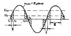 要指出的是所謂“過零”并非真的必須是電源電壓波形的零處,而一般是指在10~25V或-(10~25)V區(qū)域內(nèi)進行觸發(fā),如圖2所示。圖中交流電壓分三個區(qū)域,Ⅰ區(qū)為-10V~+10V范圍,稱為死區(qū),在此區(qū)域中加入輸入信號時不能使SSR導通。Ⅱ區(qū)為10~25V和-(10~25)V范圍,稱為響應區(qū),在此區(qū)域內(nèi)只要加入輸入信號,SSR立即導通。Ⅲ區(qū)為幅值大于25V的范圍,稱為抑制區(qū)在此區(qū)域內(nèi)加入輸入信號,SSR的導通被抑制。