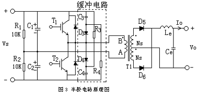 本文選用半橋電路的拓撲結(jié)構(gòu)形式,采用電壓型反饋控制模式?!“霕螂娐返脑韴D如圖3。