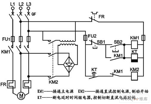 制動過程:按下停止按鈕SB1→KM1斷電,KM1主觸點斷開,電機脫離電源,KM1輔助常閉觸點恢復閉合,KM2通電,接入直流電源,制動開始,同時KM1輔助常開觸點又恢復斷開,則KT線圈呈斷電狀態(tài),延時開始,待所設(shè)延時時間到達后,KT的延時斷開常開觸點恢復斷開,KM2失電,切斷直流電源,制動結(jié)束。
