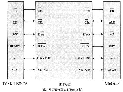 由于系統(tǒng)采用雙CPU,為了實(shí)現(xiàn)兩個CPU之間大量數(shù)據(jù)的快速交換,本裝置采用雙口RAM來實(shí)現(xiàn)兩CPU之間快速的數(shù)據(jù)交換。