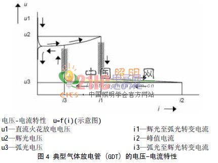 由于浪涌干擾所致,一旦加在氣體放電管兩端的電壓超過火花放電電壓(圖4的u1)時,放電管內(nèi)部氣體被電離,放電管開始放電。放電管端的壓降迅速下降至輝光放電電壓(圖4的u2)(u2在表2中的數(shù)值為140V或180V,與管子本身的特性有關(guān)),管內(nèi)電流開始升高。隨著放電電流的進一步增大,放電管便進入弧光放電狀態(tài)。在這種狀態(tài)下,管子兩端電壓(弧光電壓)跌得很低(圖4的u3)(u3在表2中數(shù)值為15V或20V,與管子本身的特性有關(guān)),且弧光電壓在相當寬的電流變動范圍(從圖4的i1→i2過程中)內(nèi)保持穩(wěn)定。因此,外界的高電壓浪涌干擾,由于氣體放電管的放電作用,被化解成了低電壓和大電流的受保護情況(u3和i2),且這個電流(從圖4的i2→i3)經(jīng)由氣體放電管本身流回到干擾源里,免除了干擾對燈具可能帶來的危害。隨著浪涌過電壓的消退,流過氣體放電管的電流降到維持弧光放電狀態(tài)所需的最小值以下(約為10mA~100mA,與管子本身的特性關(guān)),弧光放電便停止,并再次通過輝光放電狀態(tài)后,結(jié)束整個放電狀態(tài)(熄弧)。