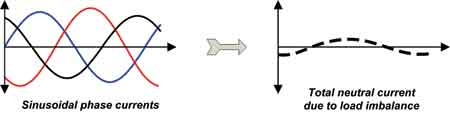 所有中性導線都并入配電板中的一個大直徑中性導線,就像一個變壓器一樣(見圖5)。在線性負載情況下,多相位系統(tǒng)的中性電流在一定程度上相互抵消。由于負載不平衡(見圖3),只有總中性電流的一小部分保留了下來。