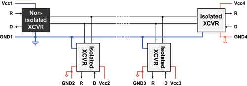 圖8顯示了兩個遠程收發(fā)器節(jié)點的詳細連接,而圖9則顯示了一個使用了多個收發(fā)器的隔離式數(shù)據傳輸系統(tǒng)的例子。除1個收發(fā)器以外,所有其他的收發(fā)器均通過隔離連接至總線。左側的非隔離收發(fā)器為整個總線提供了單接地參考。