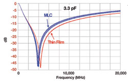 薄膜電容器(如圖1所示)還具有一項(xiàng)前面沒有提及的性能優(yōu)勢(shì):它的響應(yīng)只有1個(gè)諧振點(diǎn),因?yàn)檫@種器件使用單絕緣層設(shè)計(jì)封裝成多層陶瓷電容器(MLCC)。圖2顯示了這種薄膜電容器的部分S21前向傳輸損耗特性曲線。