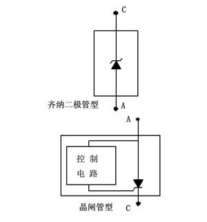 NUD4700是一種兩端器件,其外形如圖3所示,A端為陽極,C端為陰極。其內(nèi)部結(jié)構(gòu)如圖2的下圖所示,它由控制電路及單向晶閘管組成。