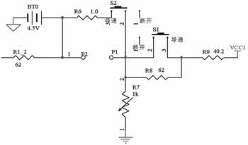 根據(jù)鋰電池保護IC的工作原理設(shè)計的測試電路如圖2所示,圖3詳細說明了圖2中模塊B的電路。模塊A在測試過流保護時為CS引腳提供電壓,模擬圖1中的CS引腳所探測到的電壓。調(diào)整模塊中的可變電位器可為CS引腳提供可變電源,控制其中的跳變開關(guān)可為CS提供突變電壓。模塊B為電源,模擬為IC提供工作電壓。調(diào)整電路中的可變電位器R7可為整個電路提供一個可變電壓,在測試過充電保護電壓和過放電保護電壓時使用。控制模塊中的開關(guān)S1的閉合為測試電路提供一個跳變電源,在測試IC的過充、過放和過流延遲時使用。