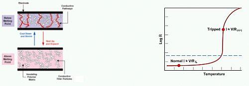 正溫度系數(shù)熱敏電(PPTC)保護元件採用半晶態(tài)聚合物和導(dǎo)電性顆粒制成。在正常溫度下,這些導(dǎo)電性顆粒形成位于聚合物中形成低阻值的電鏈路圖(圖2)。不管其熱量來自流經(jīng)該元件的大電流還是環(huán)境溫度的上升,在溫度上升到超過器件的開關(guān)溫度(Tsw)時,聚合物內(nèi)的晶體都會融化,形成非晶體物質(zhì)。在晶體物質(zhì)融化的過程中,其體積變大,造成導(dǎo)電性顆粒出現(xiàn)分離現(xiàn)象,并導(dǎo)致元件阻抗呈大幅度非線性增加。