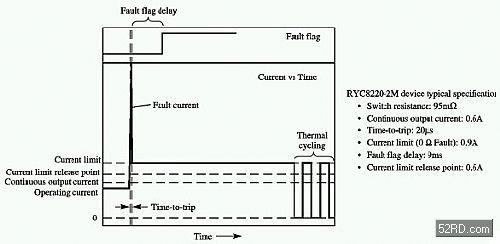 在動作之后,埠處最初的功率耗散是硅元件限制電流的函數(shù)。如果此元件可以在故障狀態(tài)下關(guān)斷,則埠的電流消耗和功率消耗可以忽略不計。如果控制電路無法執(zhí)行這項功能(例如致能Pin在高電位啟動的元件一直接在高電位上,或者電源開關(guān)功能并未內(nèi)置此功能在元件之中時),則絕大多數(shù)硅元件將繼續(xù)對電流進行限制,直至其達到內(nèi)部溫度門檻。在達到這個溫度門檻后,元件將開始對埠進行防止過熱的循環(huán)週期。在這種狀態(tài)下的平均埠消耗電流是熱循環(huán)週期此和電流限制的函數(shù)。對于使用硅元件的小功率應(yīng)用,重要之處在于配備正確的開/關(guān)電路以防止過高的“動作”狀態(tài)下的消耗功率。