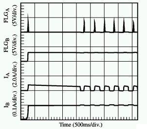 PowerSwitch電源開關(guān)元件檢測到了通道A的故障,并開始限制電流。而只有在通道A,PowerSwitch將真正地開始ON/OFF循環(huán)週期直至故障現(xiàn)象消失。而通道B上的連續(xù)電流處于技術(shù)規(guī)范之內(nèi),其工作保持不受影響。