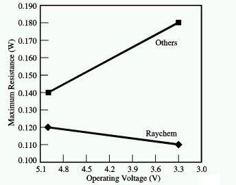 在USB的設(shè)計中,另一項重要的考慮因素是隨著電壓的下降,電阻值也會下降。隨著供電電壓的下降,電壓降問題顯得更加突出。一般來說,電壓下降將導(dǎo)致電源開關(guān)的導(dǎo)通電阻增加,這是一種不期望的特性。但Raychem的PowerSwitch元件的電阻卻能夠隨著供電電壓的下降而下降,因而避免這不利特性。如圖7所示,在匯流排電壓較高時,PowerSwitch能夠減少輸出電流值,提升電源的效率和電池的使用壽命。在匯流排電壓較低時,PowerSwitch兩端的電壓降也會降低,這樣USB功能就能繼續(xù)工作一段更長的時間。