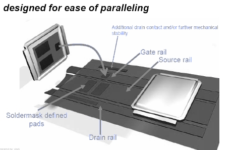 除了裸芯片,IR亦將提供專有的芯片載體解決方案。該方案附有正面金屬可焊IGBT,來支持那些生產(chǎn)線沒有能力處理裸芯片的客戶。最先進的高性能IGBT是以非常纖薄的晶圓制造,厚度僅為60到70微米。這些硅晶圓既薄且具彈性,就如紙張一樣,所以必須使用極為專業(yè)的程序和昂貴的器材去處理。很多第一級和第二級的系統(tǒng)供應(yīng)商都不愿意投資這種昂貴的器材,也不想經(jīng)歷需要長久學習才會熟練的纖薄芯片處理過程,更不希望要承受薄芯片處理期間非常高的良率耗損。