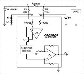 圖1給出了一個過壓保護例子,由齊納二極管Z1和Z2、電阻R1和R2以及二極管D1組成。MAX4372放大器的共模電壓范圍為0至28V,足以測量6V至18V范圍的汽車電池電壓。但是,拋負(fù)載電壓可能達到35V,而且會持續(xù)0.5秒,恰好超過了放大器的30V最大額定輸入電壓,必須通過外部電路保護放大器。