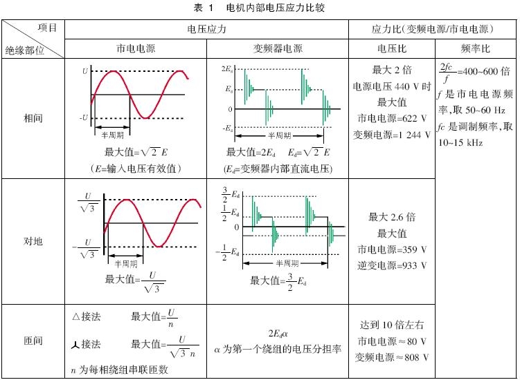 電機(jī)內(nèi)部的斷面如圖7 所示。電機(jī)有定子和轉(zhuǎn)子,定子內(nèi)有安放三相線圈的槽。如果放大槽的內(nèi)部,可以看到有許多的線圈(漆包線),各線圈對地之間、各相之間、線匝相互之間都有絕緣存在。通常對地、相間都有絕緣紙插入,而線匝之間沒有絕緣紙插入,它利用堅固的漆包線的漆層獲得絕緣。微浪涌電壓給這些絕緣全部帶來影響,這些絕緣損壞之中,線圈匝間損壞最多。表1 列出了有關(guān)電機(jī)內(nèi)部各絕緣部分承受的電壓值,也稱為電壓應(yīng)力,提供了用市電電源驅(qū)動電機(jī)和用變頻器驅(qū)動時相比較的資料。