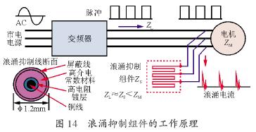 浪涌抑制組件的工作原理如圖14 所示。浪涌抑制組件內(nèi)部卷繞的浪涌抑制線具有和電纜線的阻抗ZL相同的阻抗,因此接到電機(jī)的接線端子上降低了電機(jī)接線端子的阻抗,從而減少了阻抗不匹配時的反射波。通常高頻波成分在電纜線上的阻抗ZL是50耀100 贅,設(shè)計的浪涌抑制線的阻抗ZS是50~60歐。