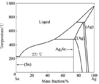 在Sn-Ag二元相圖上(圖1),僅存在兩種Sn-Ag中間金屬化合物(IMC),一是Ag4Sn (ζ相),另一個(gè)是Ag3Sn(ε相)。 在過去一些學(xué)者如Sen等[2]發(fā)現(xiàn)在氣相沉積Sn/Ag偶在室溫條件下形成Ag3Sn IMC; 另外Arai等[3]發(fā)現(xiàn)在電鍍共沉積Sn-Ag合金中也只形成Ag3Sn金屬化合物。
