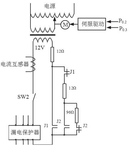 測(cè)試電流產(chǎn)生和調(diào)節(jié)模塊如圖2所示。測(cè)試電流的產(chǎn)生是將50Hz、220V的正弦交流電經(jīng)過(guò)220:12的降壓變壓器和電動(dòng)調(diào)壓器,輸出0~12V的正弦交流電,再通過(guò)回路電阻,產(chǎn)生需要的測(cè)試電流。測(cè)試電流的產(chǎn)生分為3檔,以滿足不同的測(cè)量范圍。繼電器J1吸合,可產(chǎn)生0~1000mA的測(cè)試電流;繼電器J2吸合,可產(chǎn)生0~500mA的測(cè)試電流;繼電器J1、J2都不吸合,可產(chǎn)生0~100mA的測(cè)試電流。每一檔測(cè)試電流的調(diào)節(jié)通過(guò)LPC2132控制電動(dòng)調(diào)壓器實(shí)現(xiàn)。為了使測(cè)試電流能均勻地變化,電動(dòng)調(diào)壓器采用了交流伺服控制。在測(cè)試過(guò)程中,LPC2132對(duì)采集到的實(shí)時(shí)回路中的測(cè)試電流值與設(shè)定值比較,并計(jì)算得到控制量,控制伺服電動(dòng)機(jī)轉(zhuǎn)動(dòng),帶動(dòng)電動(dòng)調(diào)壓器的電刷在副邊上穩(wěn)定地滑動(dòng),使副邊電壓變化,從而改變回路中的電流。LPC2132的P0.2腳輸出脈沖信號(hào)控制伺服電動(dòng)機(jī)的運(yùn)動(dòng)速度,P0.3腳輸出高或低的電平信號(hào),控制伺服電動(dòng)機(jī)轉(zhuǎn)動(dòng)的方向。
