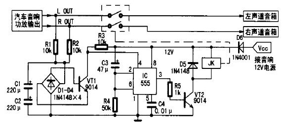 1.在接通音響電源的瞬間,因電容C3兩端電壓不能突變,可視為短路,則時(shí)基電路555的②、⑥腳電位高于2/3 Vcc,故555處于復(fù)位狀態(tài),③腳輸出低電平,晶體管VT2截止,繼電器JK常開觸點(diǎn)不動(dòng)作。同時(shí)+12 V電壓通過(guò)電阻R4向電容C3充電,延時(shí)約5s(秒鐘)后555的②、⑥腳電位降低至1/3Vcc,555被觸發(fā)置位,③腳由低電平變?yōu)楦唠娖剑w管VT2導(dǎo)通,繼電器JK得電,常閉觸點(diǎn)閉合,從而實(shí)現(xiàn)了延遲一段時(shí)間將揚(yáng)聲器接入功放,徹底消除了開機(jī)時(shí)大電流對(duì)揚(yáng)聲器的沖擊;