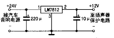 具體制作如下:先把功放輸出端與音箱的引線切斷,按圖2所示電路將引線頭a、b分別接功放的兩組輸出端,c、d分別接左、右聲道音箱:揚(yáng)聲器保護(hù)電路的電源只能從收放機(jī)中獲取,不可直接從汽車12 v電源中獲取,否則不起開/關(guān)機(jī)保護(hù)作用;若是柴油車所配置的收放機(jī)(使用24 V電源),則要求增加一個(gè)降壓電路(見(jiàn)圖3所示),給揚(yáng)聲器保護(hù)電路供電,以免電源電壓過(guò)高損壞IC。