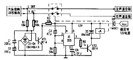 1.在接通音響電源的瞬間,因電容C3兩端電壓不能突變,可視為短路,則時(shí)基電路555的②、⑥腳電位高于2/3 Vcc,故555處于復(fù)位狀態(tài),③腳輸出低電平,晶體管VT2截止,繼電器JK常開(kāi)觸點(diǎn)不動(dòng)作。同時(shí)+12 V電壓通過(guò)電阻R4向電容C3充電,延時(shí)約5s(秒鐘)后555的②、⑥腳電位降低至1/3Vcc,555被觸發(fā)置位,③腳由低電平變?yōu)楦唠娖?,晶體管VT2導(dǎo)通,繼電器JK得電,常閉觸點(diǎn)閉合,從而實(shí)現(xiàn)了延遲一段時(shí)間將揚(yáng)聲器接入功放,徹底消除了開(kāi)機(jī)時(shí)大電流對(duì)揚(yáng)聲器的沖擊;