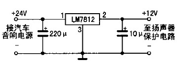 具體制作如下:先把功放輸出端與音箱的引線切斷,按圖2所示電路將引線頭a、b分別接功放的兩組輸出端,c、d分別接左、右聲道音箱:揚(yáng)聲器保護(hù)電路的電源只能從收放機(jī)中獲取,不可直接從汽車(chē)12 v電源中獲取,否則不起開(kāi)/關(guān)機(jī)保護(hù)作用;若是柴油車(chē)所配置的收放機(jī)(使用24 V電源),則要求增加一個(gè)降壓電路(見(jiàn)圖3所示),給揚(yáng)聲器保護(hù)電路供電,以免電源電壓過(guò)高損壞IC。