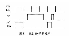 本設計逆變器為半橋式結構,串聯(lián)諧振負載,驅動采用IR公司的IR2110半橋驅動芯片。IR2110電路簡單,成本低,適用于中大功率IGBT,實驗結果也驗證了IR2110驅動中大功率IGBT的可行性。IR2110芯片有一個封鎖兩路驅動的SD輸入端,當此引腳為高電平時,立刻封鎖兩路輸出,如圖3所示。